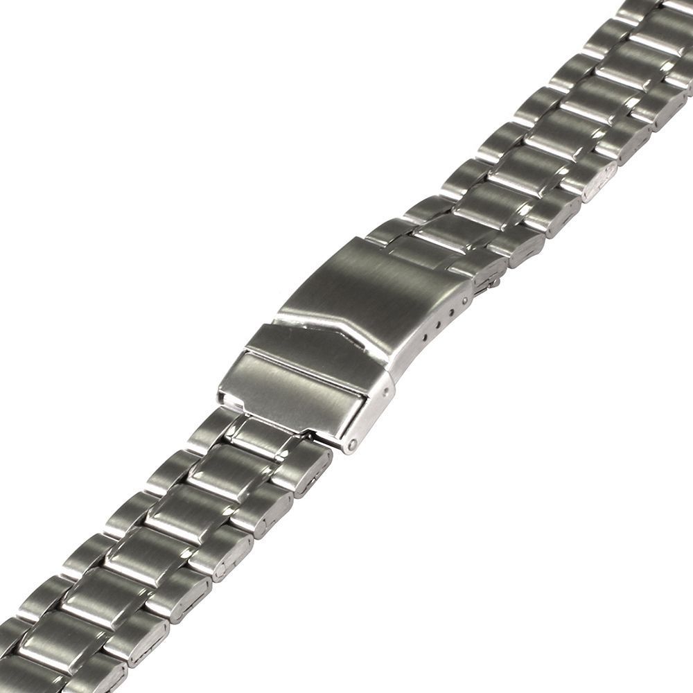 Элегантный стальной браслет укомплектован парой оконцовок под круглый корпус часов шириной 22 мм. Браслет для часов матовый, но по внешним краям среднего ряда звеньев идут две полированные полосы.