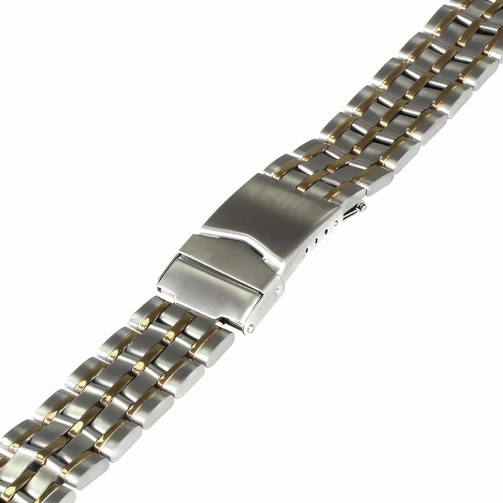 Расцветка браслета комбинированная – стальная, с двумя золотистыми полосами.