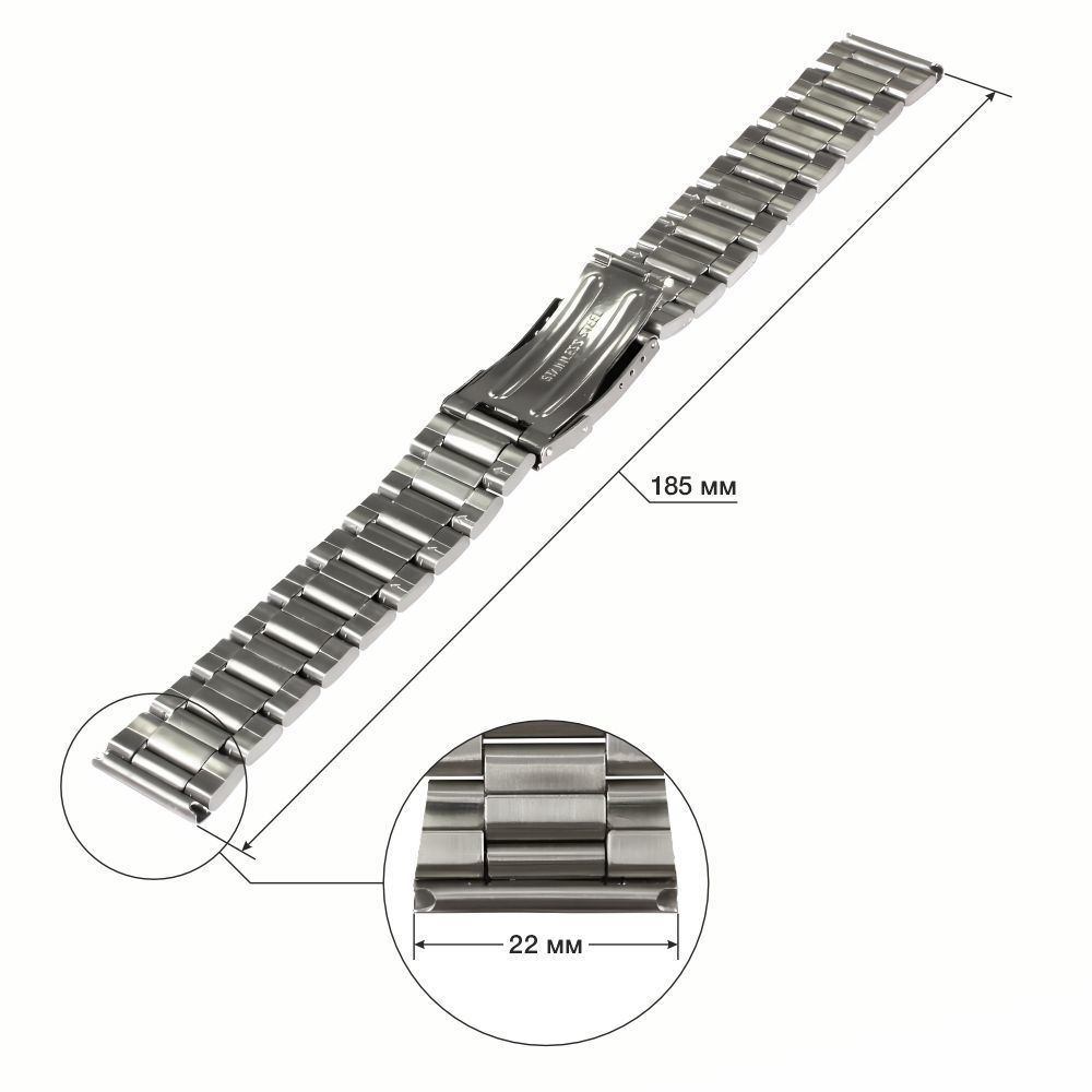 Классический мужской браслет с прямым креплением к корпусу часов. Размер браслета для часов 22 мм. Расцветка браслета комбинированная – стальная, с двумя позолоченными полосами.