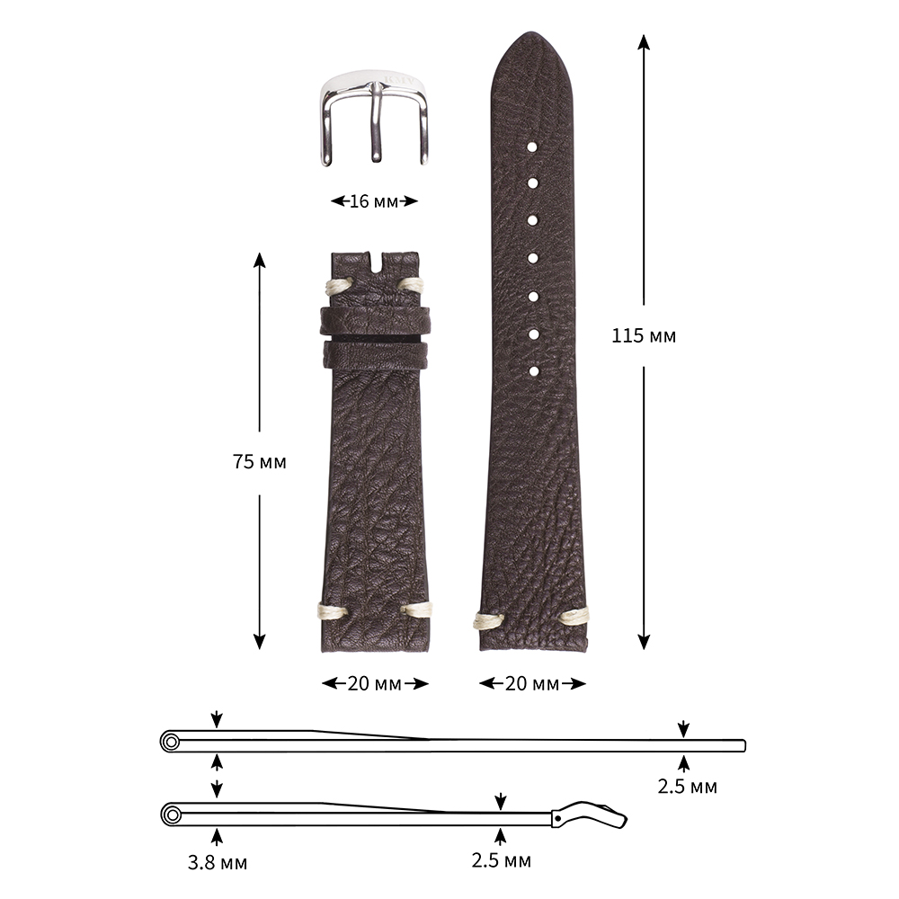 Ремешок сделан из натуральной кожи с бежевой подкладкой. Концы ремешка прошиты двумя белыми стежками из толстой хлопковой нити. Длина частей ремешка L (75мм х 115мм). Толщина 3,8 мм. Пряжка сталь 304 L. Ремешок имеет заужение от крепления корпуса часов к пряжке 4 мм. Ремешок красиво смотрится на винтажных часах и часах Diesel.
