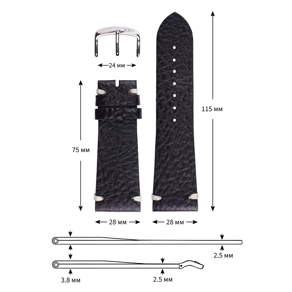 Ремень для часов "KMV" S-07, 28 мм, черный, L
