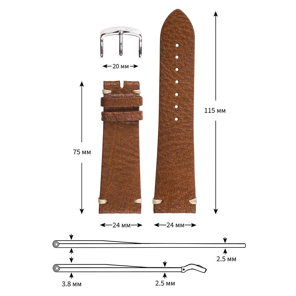 Ремешок сделан из натуральной кожи с бежевой подкладкой. Концы ремешка прошиты двумя белыми стежками из толстой хлопковой нити. Длина частей ремешка L (75мм х 115мм). Толщина 3,8 мм. Пряжка сталь 304 L. Ремешок имеет заужение от крепления корпуса часов к пряжке 4 мм. Ремешок красиво смотрится на винтажных часах и часах Diesel.