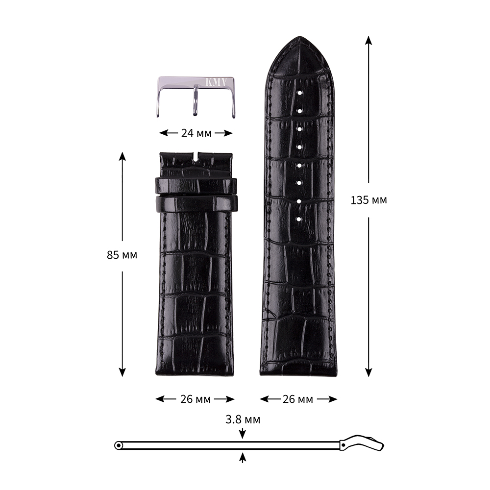 Ремень для часов "KMV" S-11, 26 мм, черный, толщина 3.8 мм, XL
