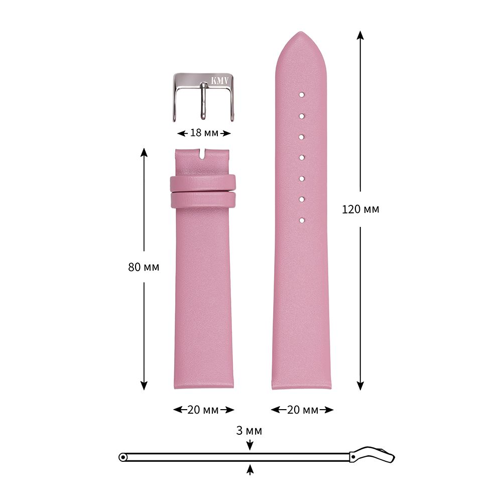Ремень для часов "KMV" S-22, 20 мм, розовый, L