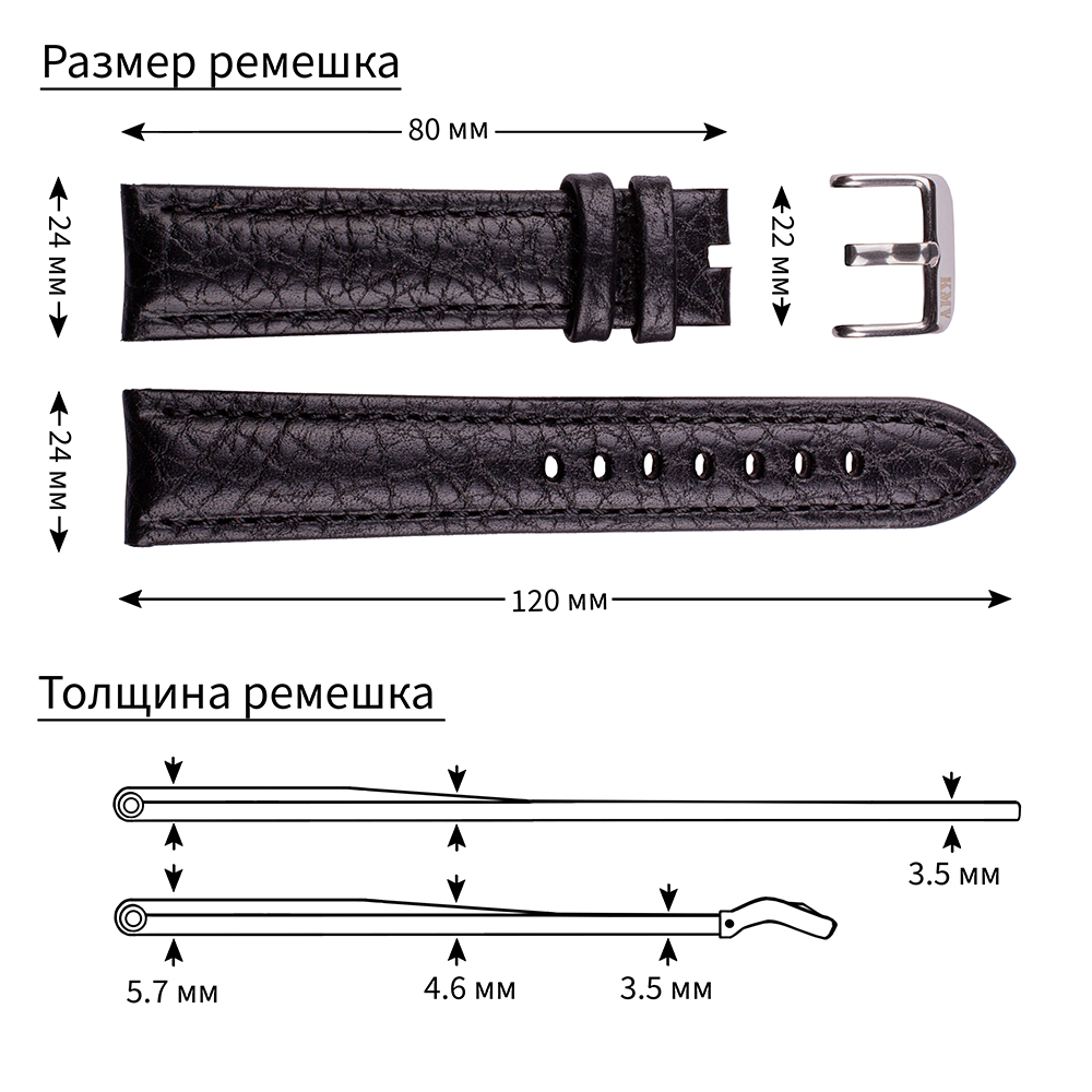 Ремень для часов "KMV" S-41, 24 р-р, черный, L