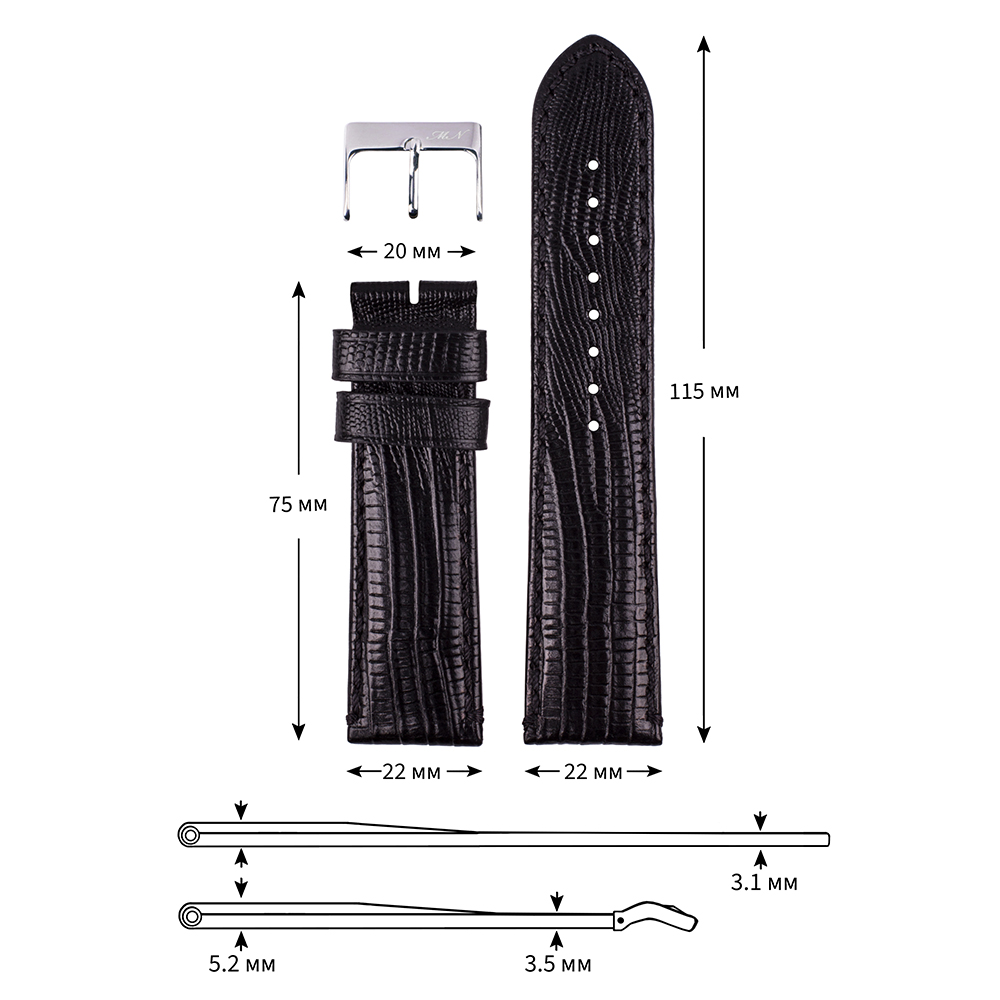 Ремень для часов "Mario Notti", S-08, 22 мм, Черный, L