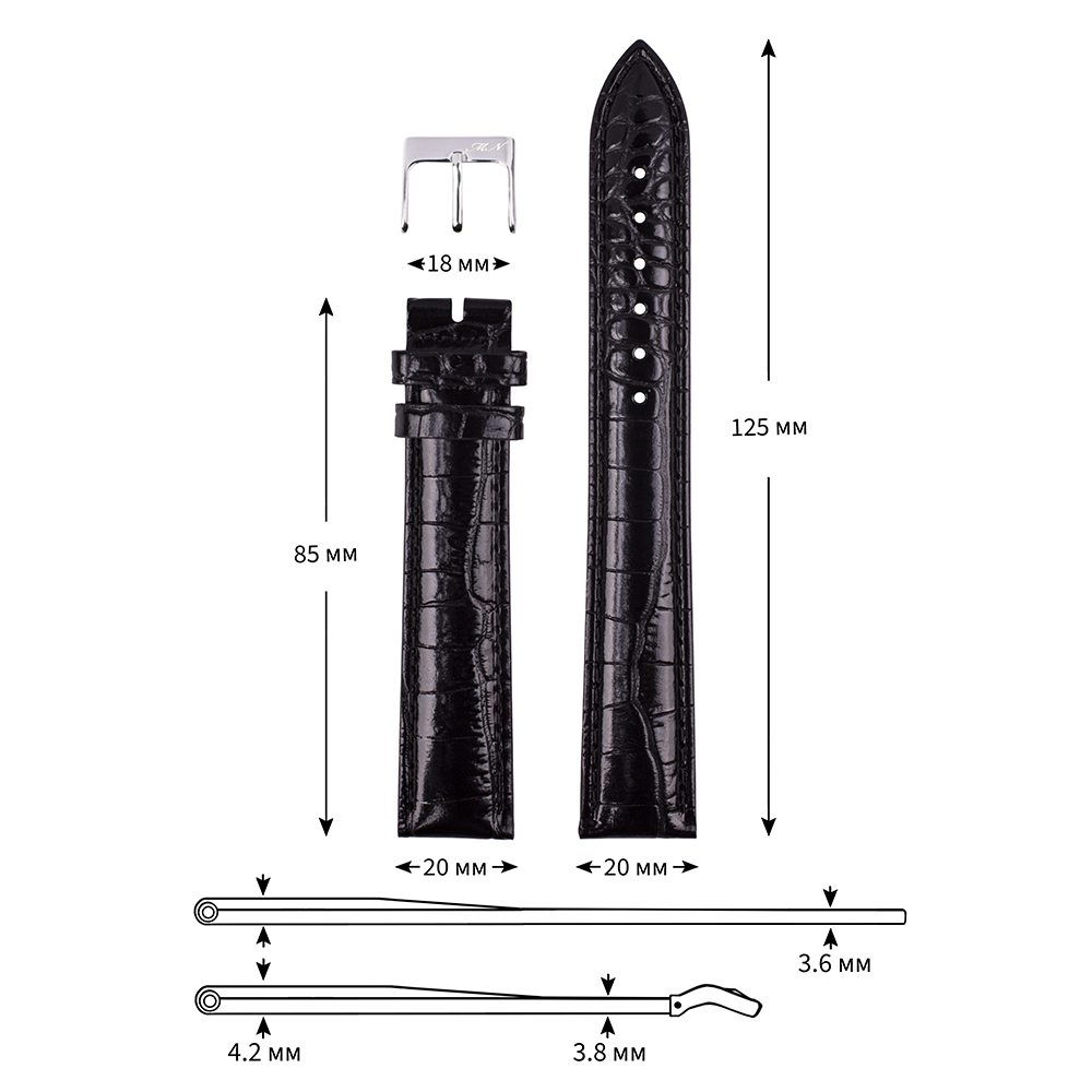 Классический ремешок из натуральной кожи с тиснением под крокодила и строчкой в тон. Глянцевый. Пряжка из нержавеющей стали. Комфортная подкладка из нубука.