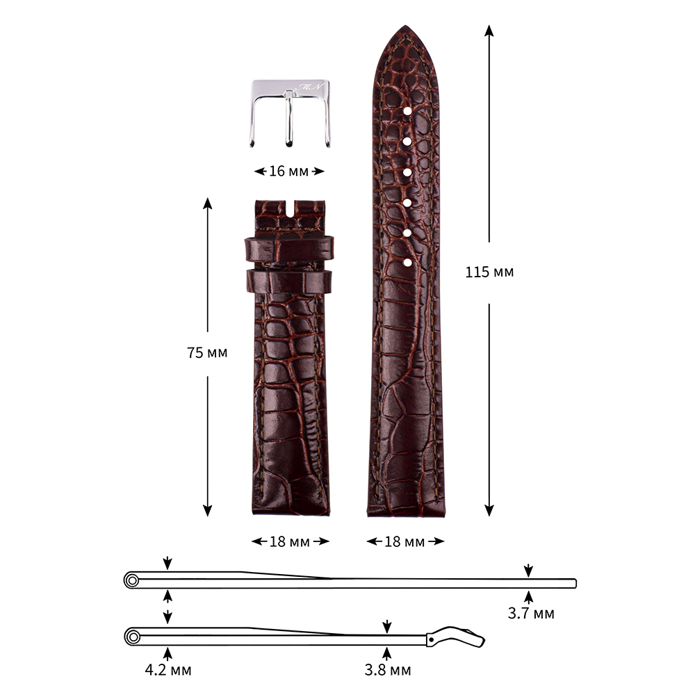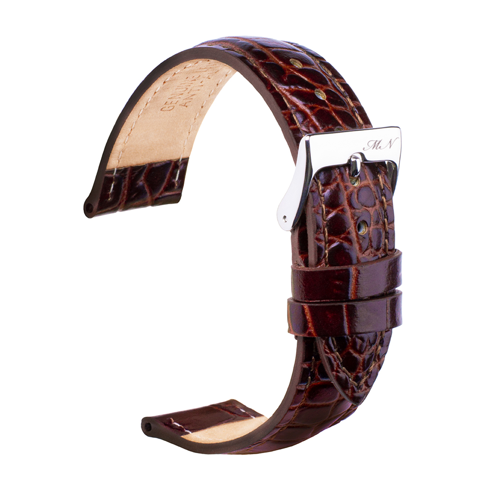 Классический ремешок из натуральной кожи с тиснением под крокодила и строчкой в тон. Глянцевый. Пряжка из нержавеющей стали. Комфортная подкладка из нубука.