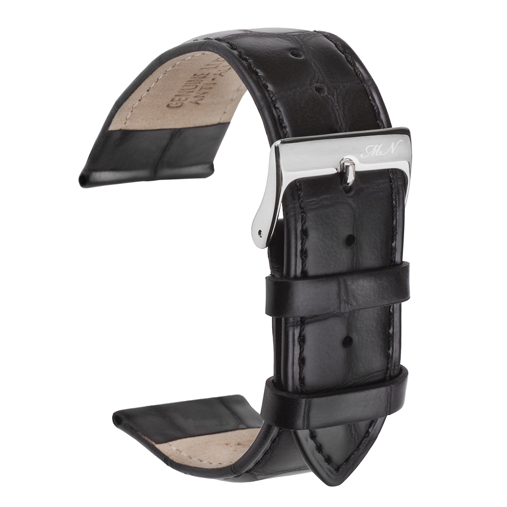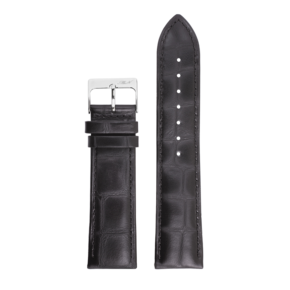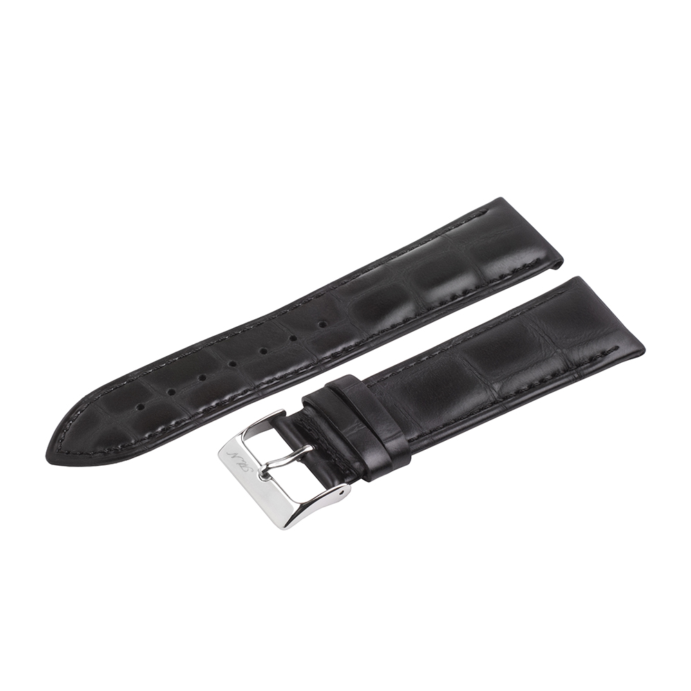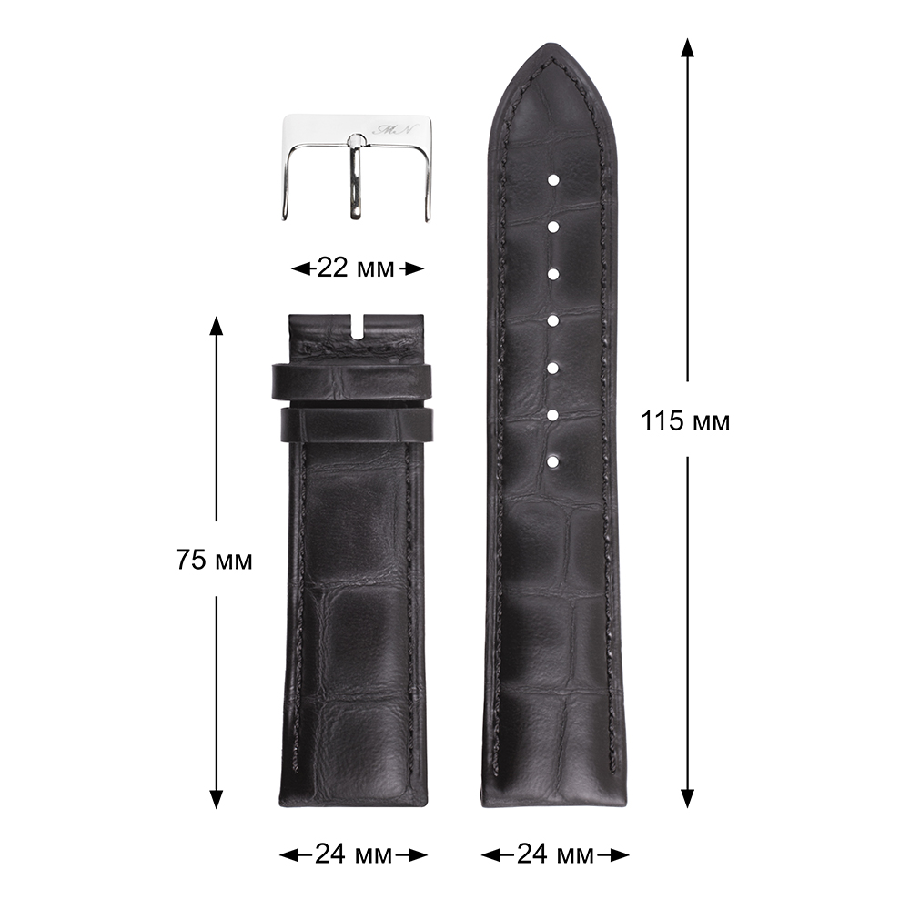 Ремешок для часов Mario Notti изготовлен из качественной блестящей натуральной кожи, с имитацией узора шкуры аллигатора. Внешний слой кожи имеет лаковое покрытие, в результате чего изделие обладает блеском средней интенсивности (средний вариант между матовой кожей и гладкой лакированной). Ремешок имеет подъем к корпусу крепления часов 5 мм. И с ужение от крепления к корпусу часов к застежке 2 мм. Длина половинок (75 мм х 115 мм). Пряжка сталь. На ремень можно поставить автоматическую застежку (клипсу). Ремешок очень хорошо смотрится на классических часах.