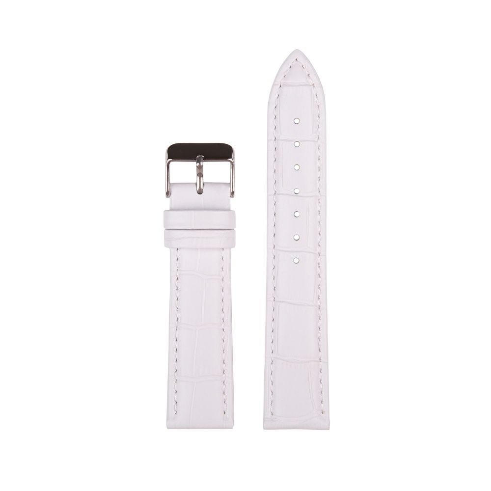 Ремешок для наручных часов из натуральной кожи белого цвета с тиснением под аллигатора и строчкой в тон ремня. Пряжка выполнена из нержавеющей, полированной стали. Подкладка изготовлена из нубука, благодаря чему минимизирован риск раздражения кожи на руке. Ремень подойдет как на женские, так и на мужские часы.