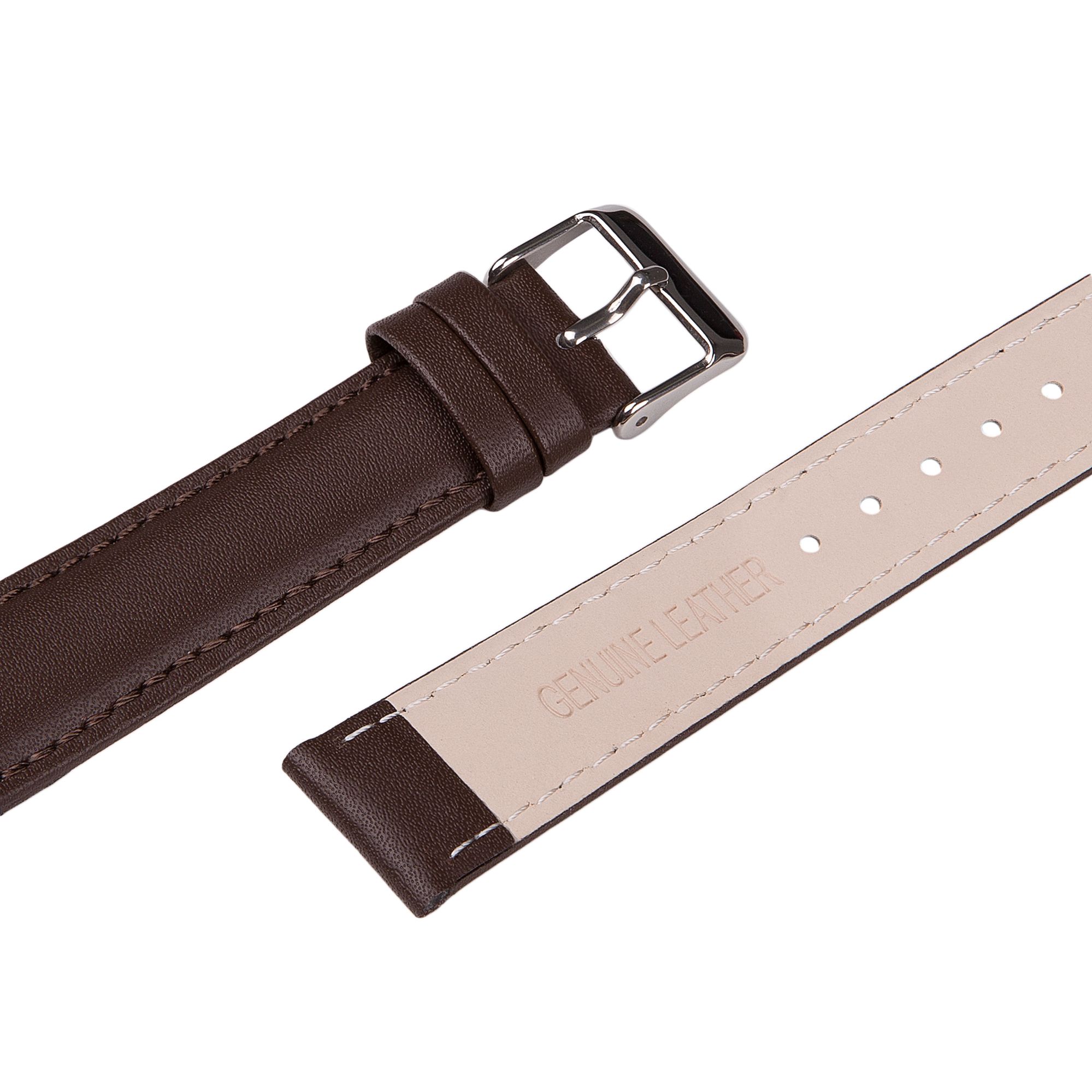 Ремешок для наручных часов из натуральной кожи коричневого цвета с гладкой матовой поверхностью и строчкой в тон ремня. Пряжка выполнена из нержавеющей, полированной стали. Подкладка изготовлена из нубука, благодаря чему минимизирован риск раздражения кожи на руке. Ремень подойдет как на женские, так и на мужские часы.