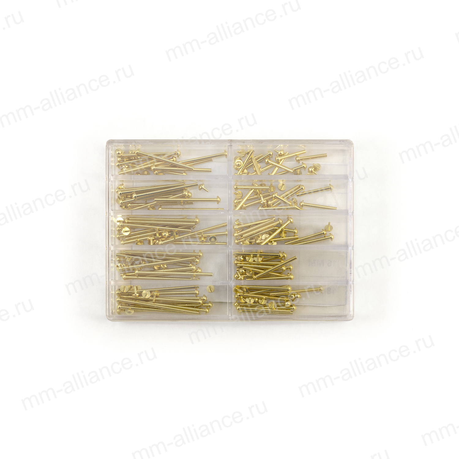 Набор штифтов с шляпкой. Позолоченного цвета. Толщина втулки - 1.3мм. Ширина шляпки - 3.0мм. Длина втулок от 10 - 28 мм. 10 размеров по 10 штук.